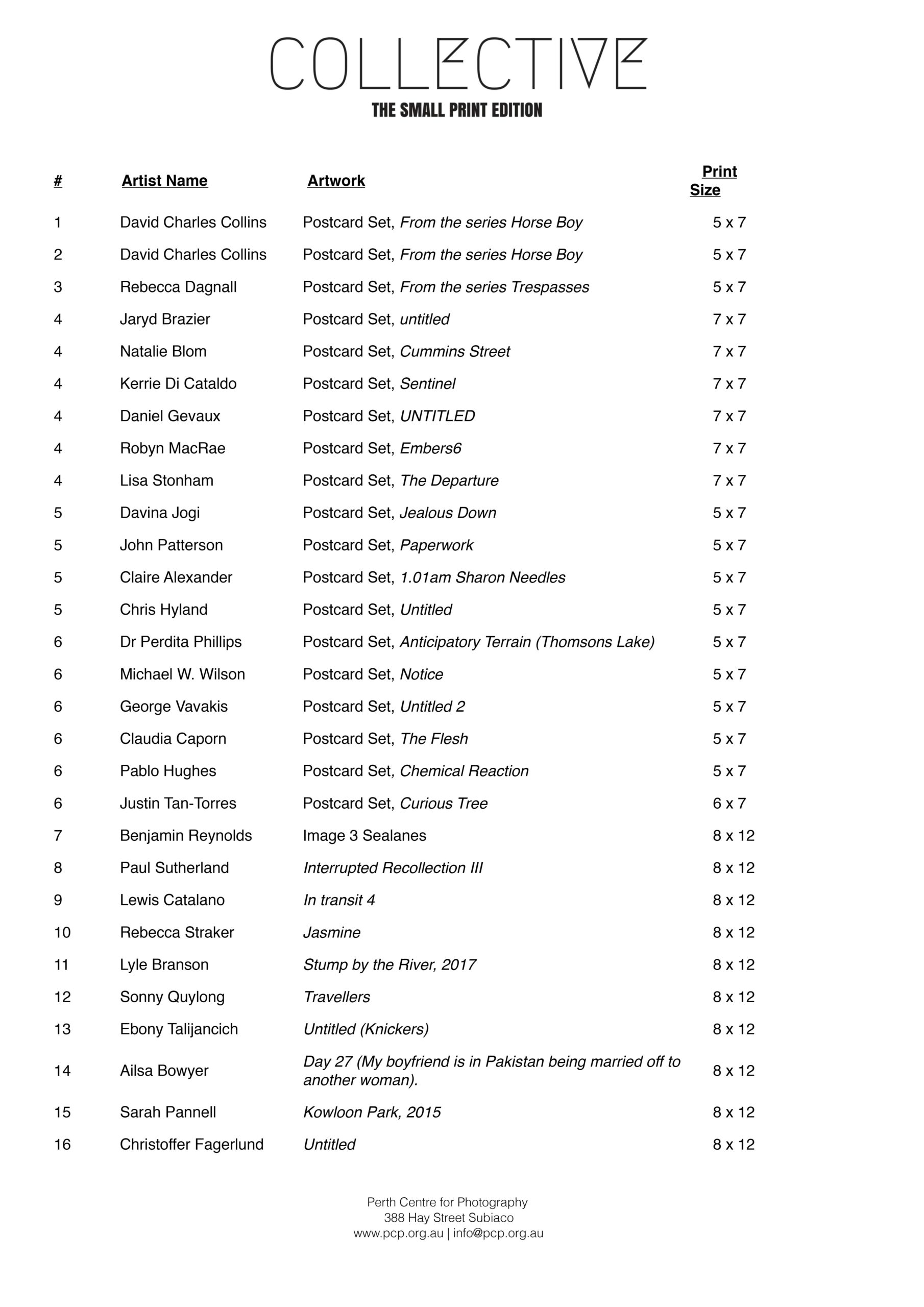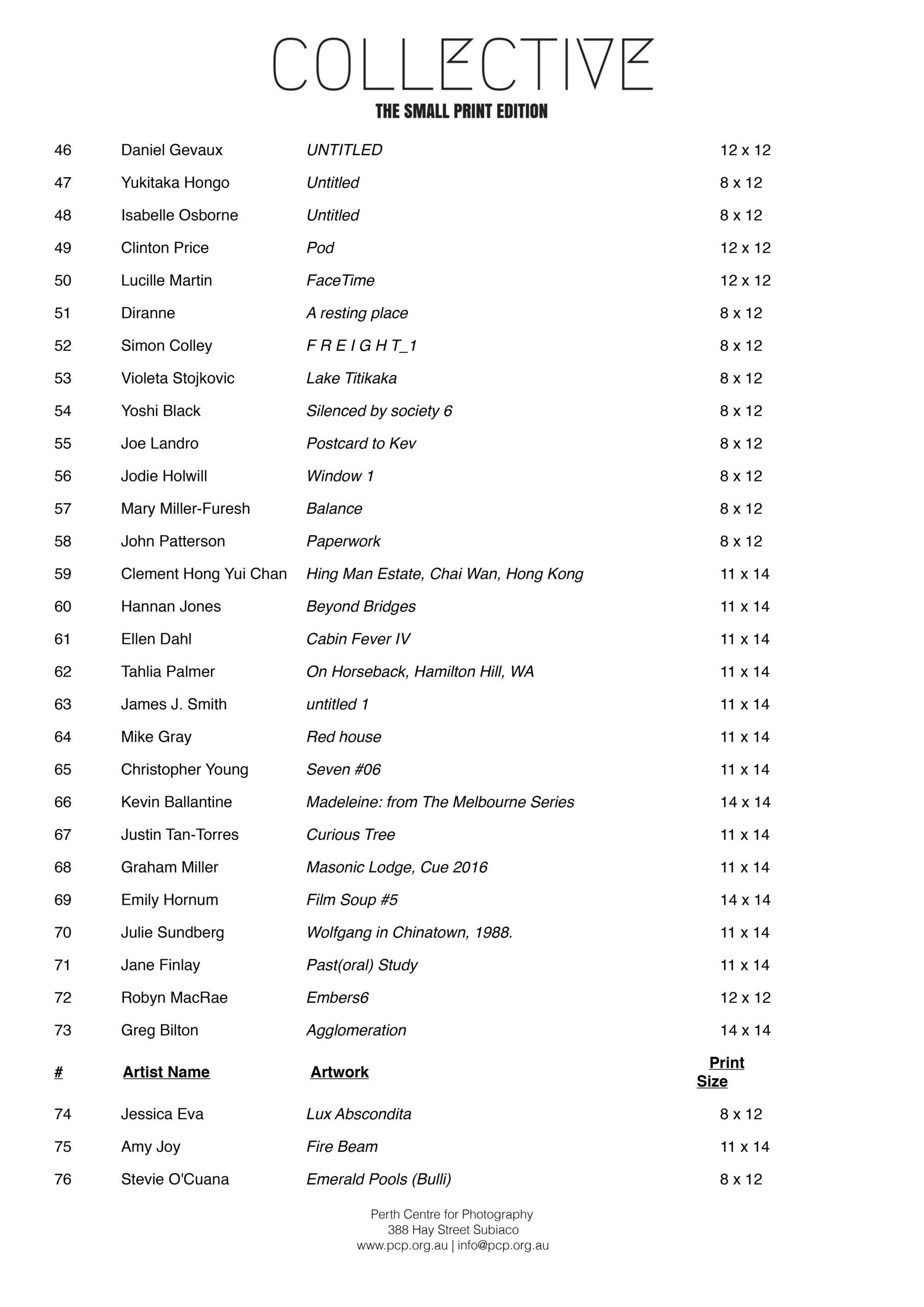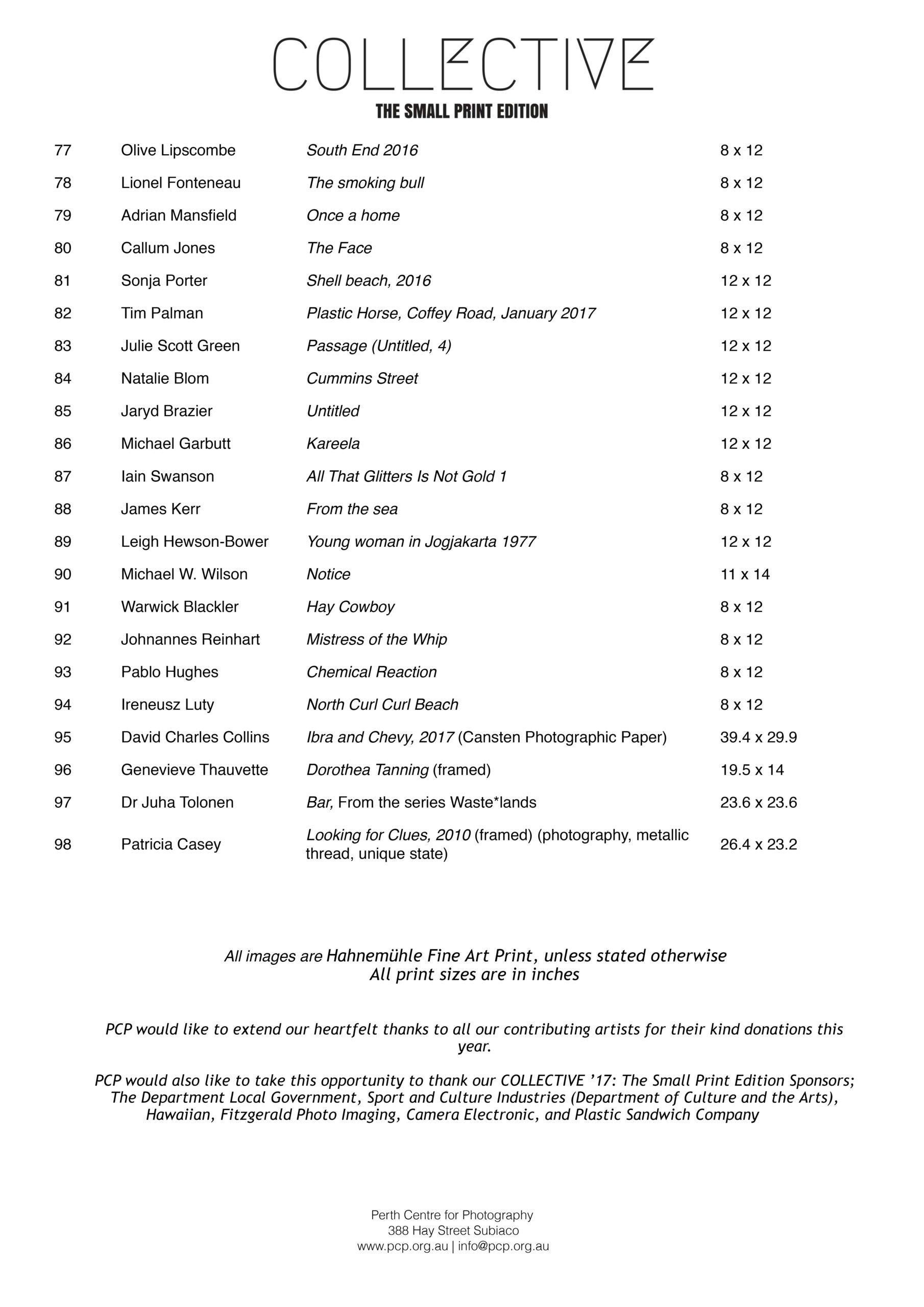 Funds collected go towards PCP’s future developments, whilst providing an opportunity for photographic artists to feature their work in a professional group exhibition alongside many other talented and accomplished photographic artists from WA and beyond.